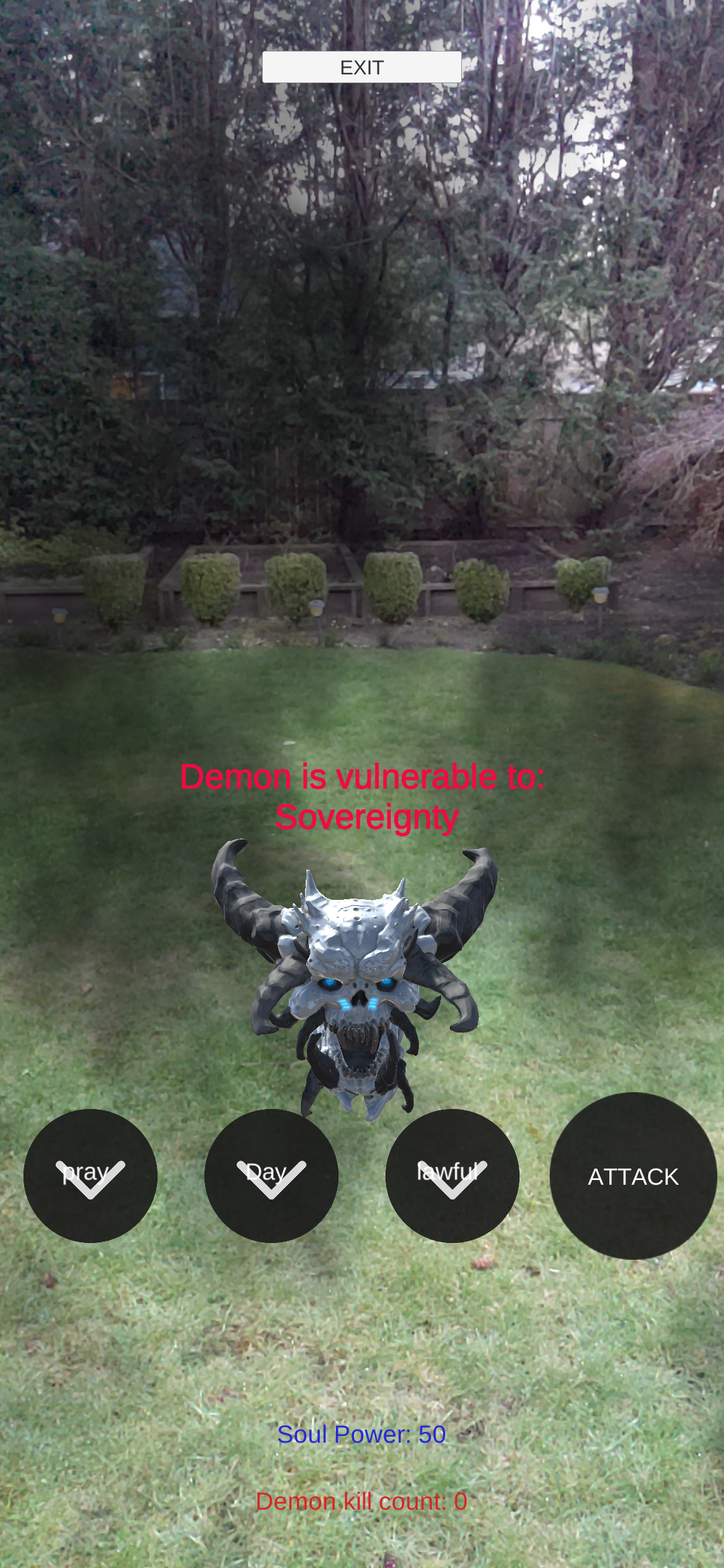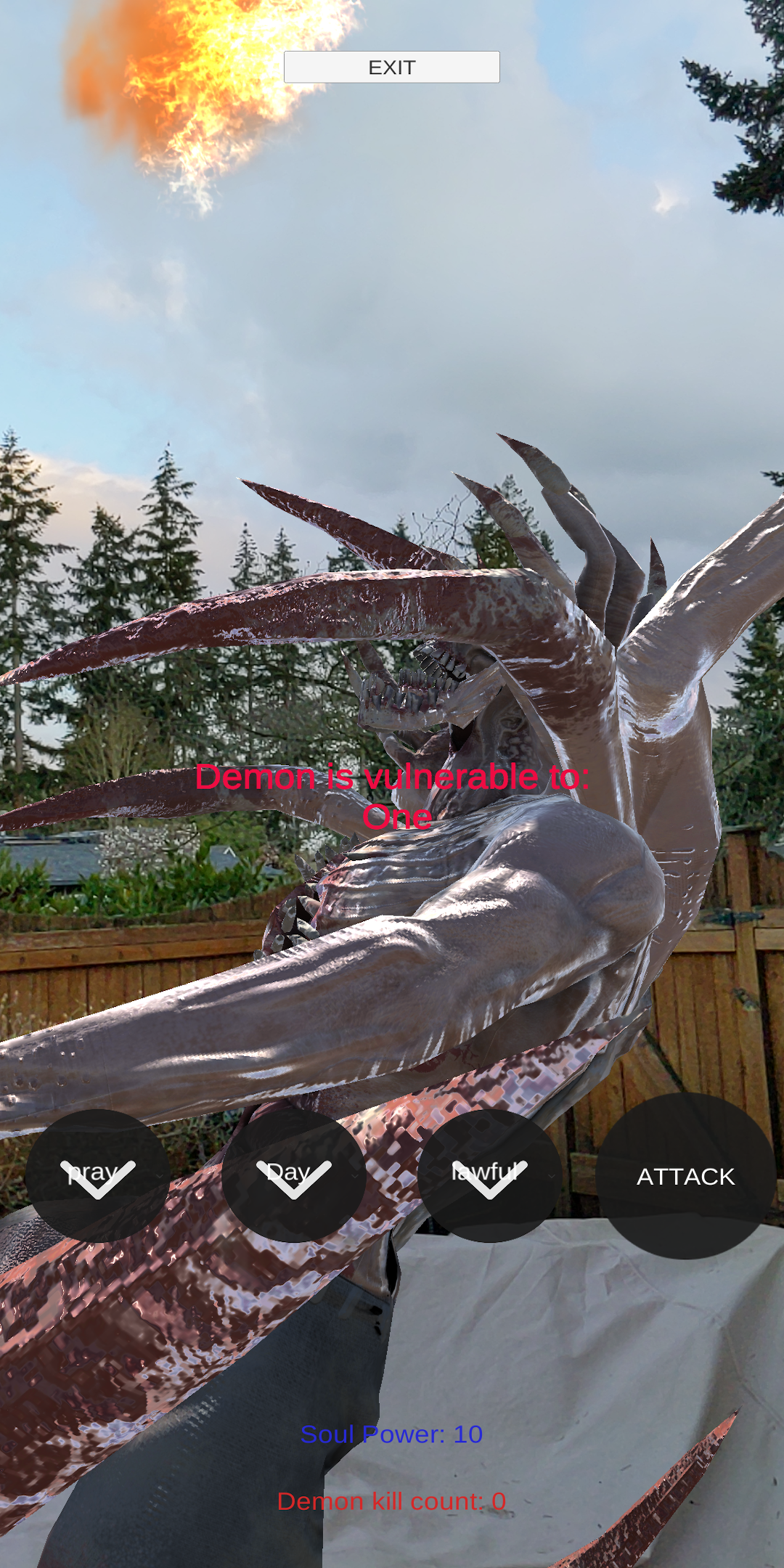 You are about to enter the world of the Unseen. There are demons and angels all around us. This game tests your memory. When a demon appears, he is vulnerable to an idea. To defeat the demon, you must select the correct combination of words that match to the idea. Different combinations match to certain ideas, non-exclusively. You have 3 tries to kill the demon that is trying to send you astray. If you fail in all 3 attempts, your soul power diminishes. Also, if you had that idea already matched, you will lose that idea from your matches. Your path to redemption is to successfully match all possible ideas with the different combinations of words provided. You will find demons on floors, walls, and elevated surfaces. NOTE: The words to idea matching do not hold meaning significance and are simply used as identifiers.